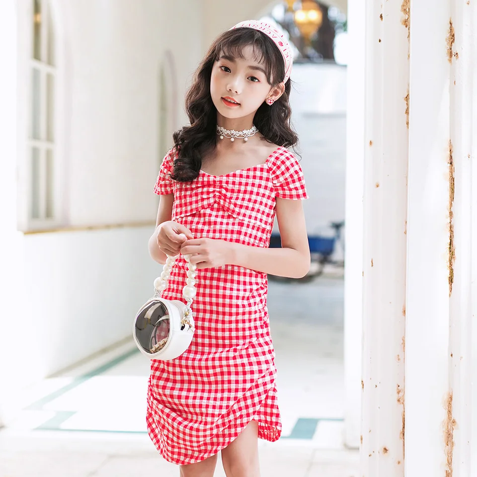 New Fashion 2020 Summer Short Sleeve Cute Girls Dresses Kids Plaid